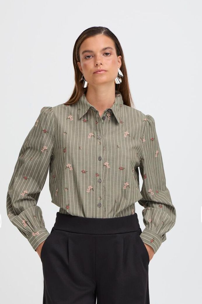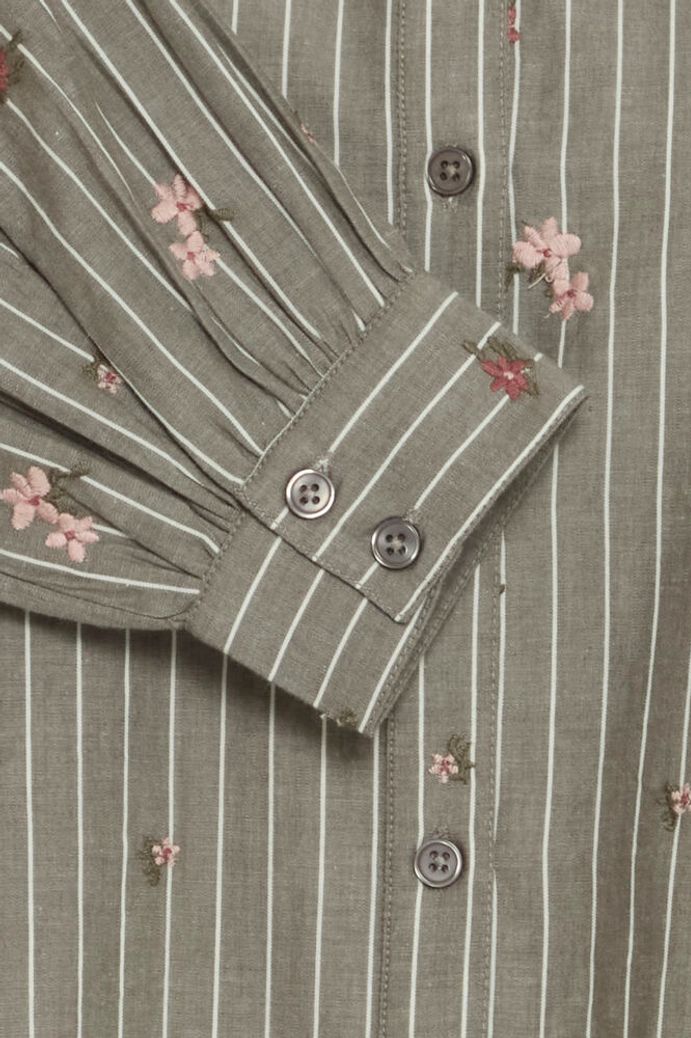 Camicia dal taglio classico/maschile con colletto e bottoni, veste dritto. Fondo grigione, riga boianca e fiorellini ricamati in rosa e bordeaux. Una delizia!