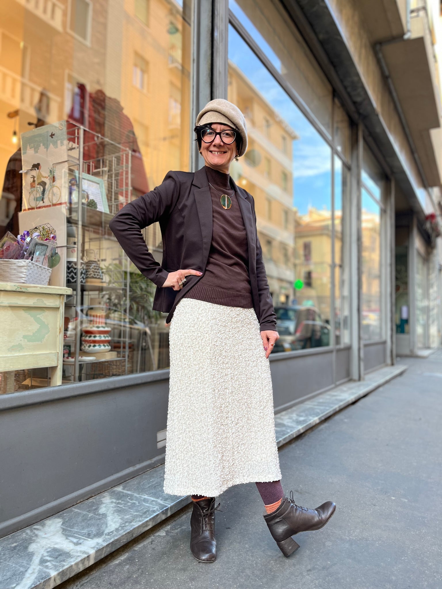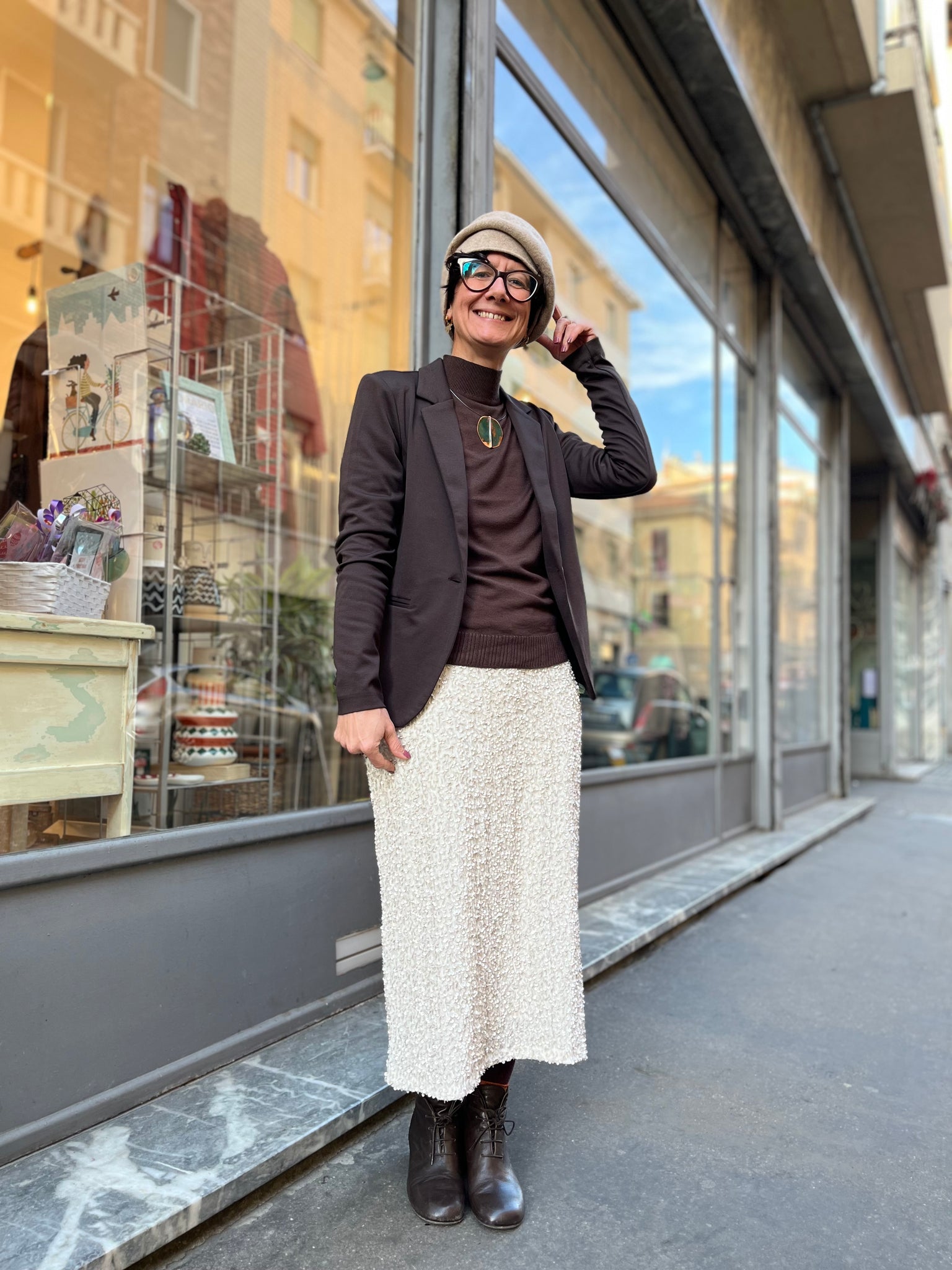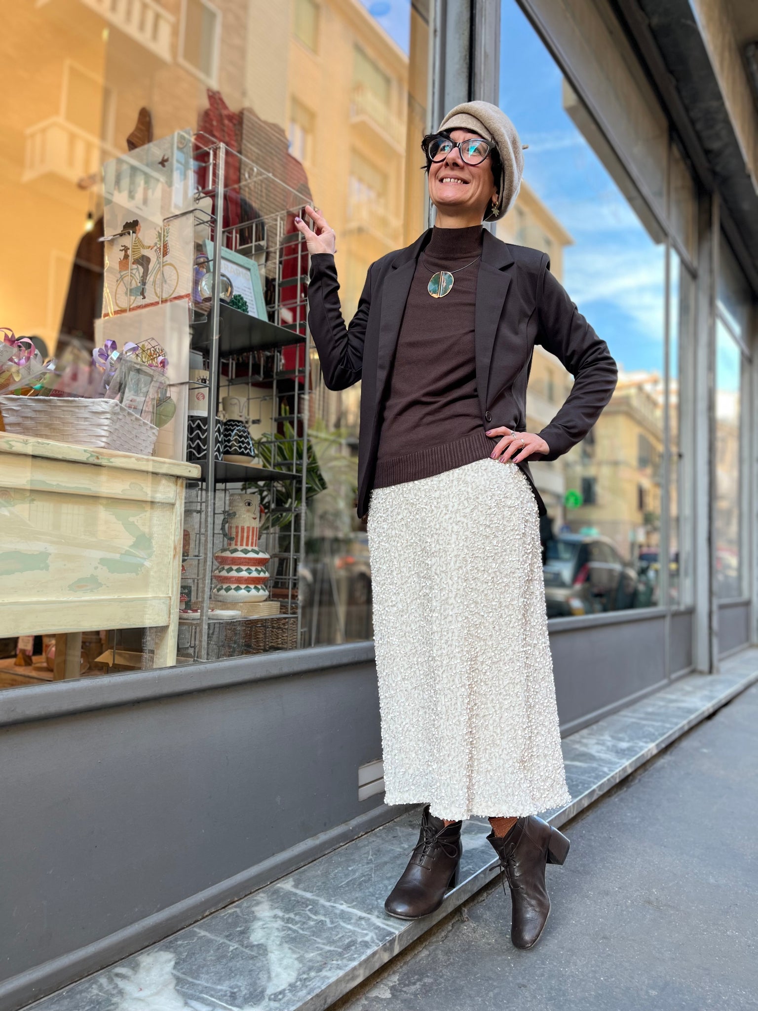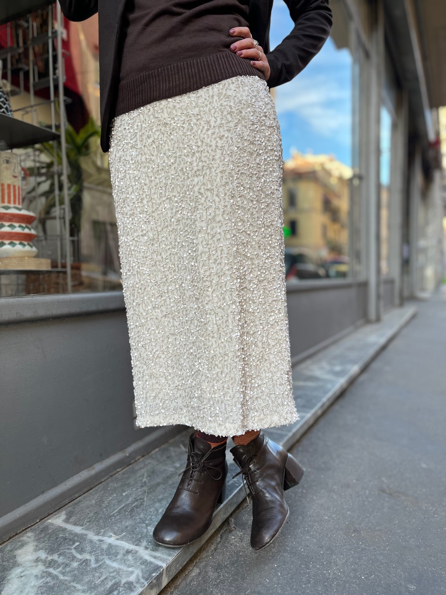 Wow!!! Gonna longuette in paillettes avorio/champagne. Super chic ma si può sdrammatizzare con un anfibio ed un giubbino in pelle! Elastico in vita, modello dritto ma non segna.