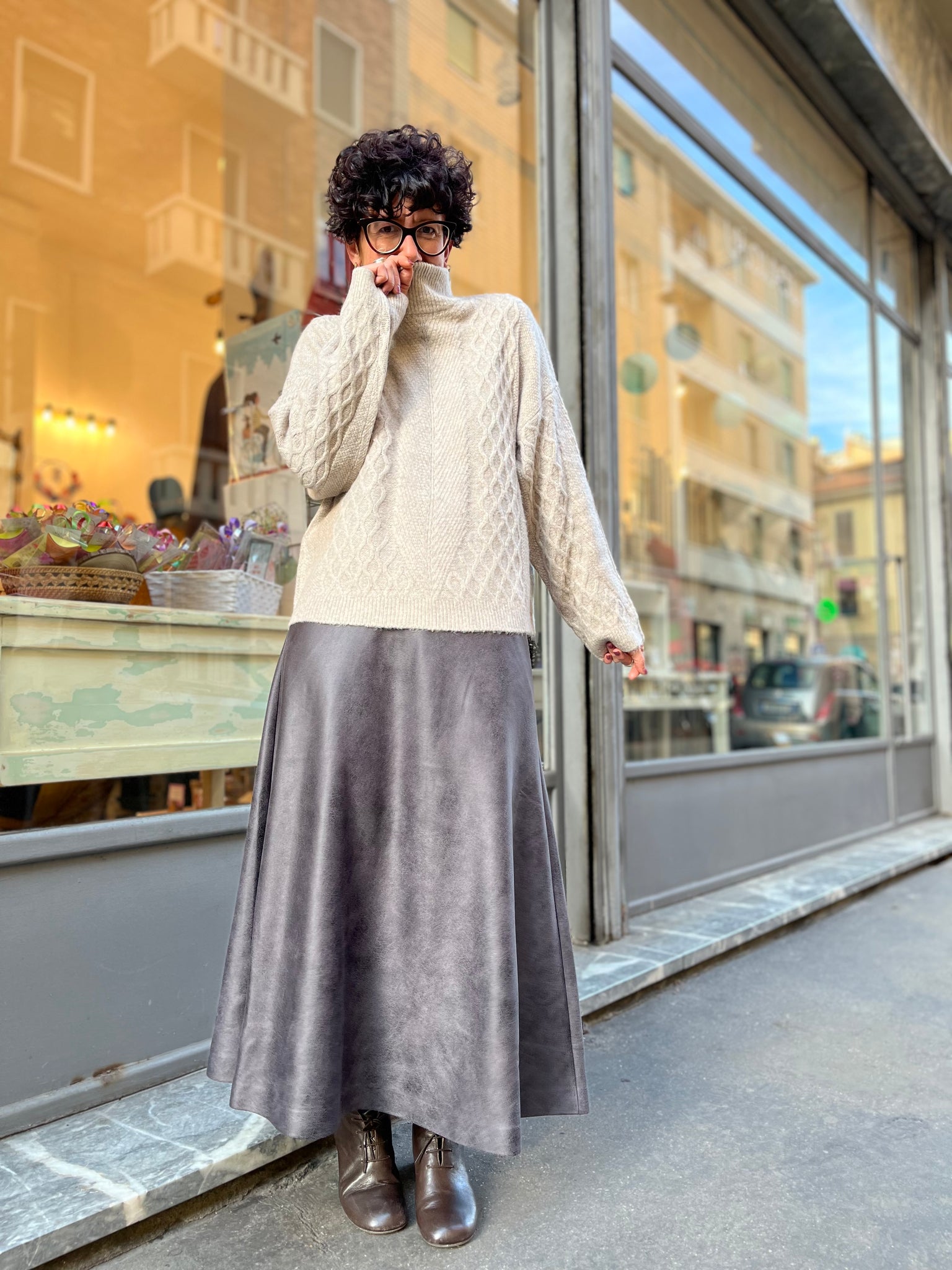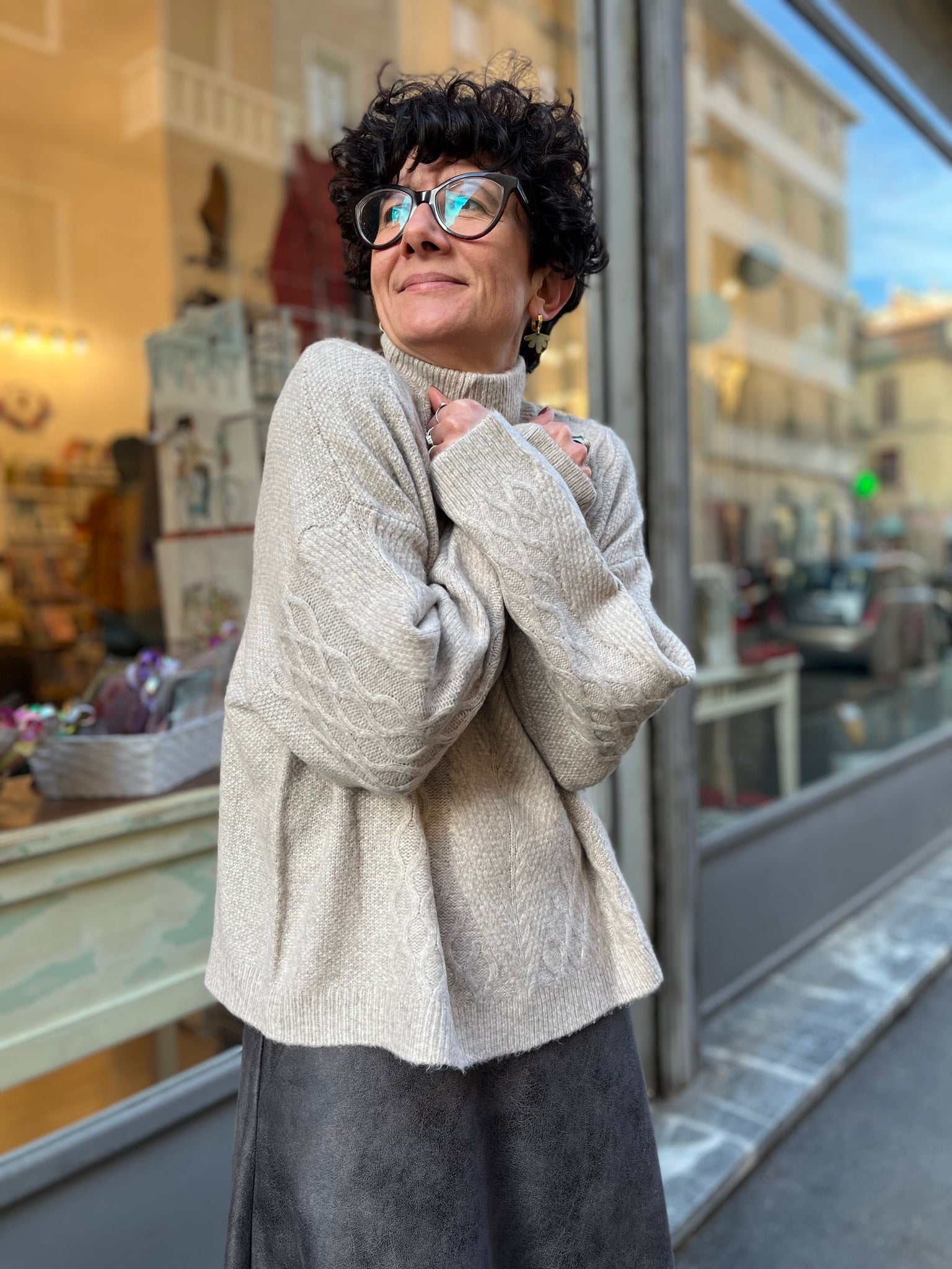 Bellissimo maglione lavorato con collo alto e manica ampia, taglio a scatoletta, vestibilità morbida e comoda. Morbidissimo!