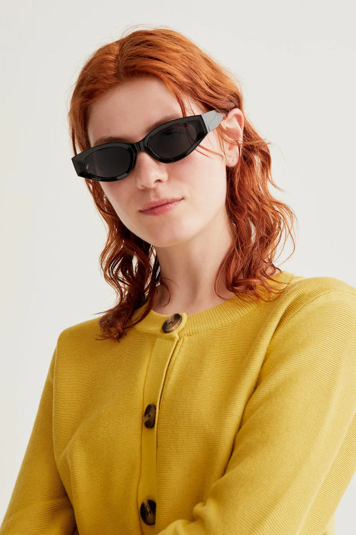 Cardigan in maglia blu. Scollo rotondo e maniche lunghe. Chiusura frontale con bottoni marroni e neri. Dettagli a costine.