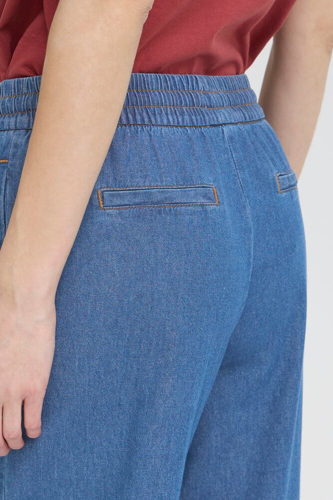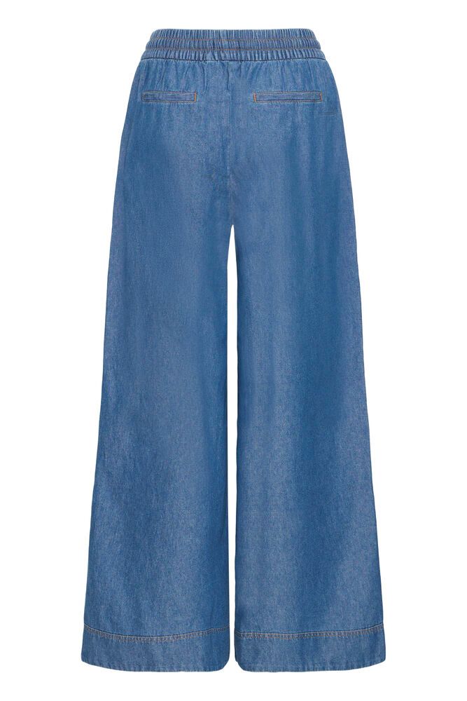 Un jeans comodissimo in cotone leggero, super fresco, gamba ampia, elastico in vita. Lungo al piede, veste regolare. 100% cotone