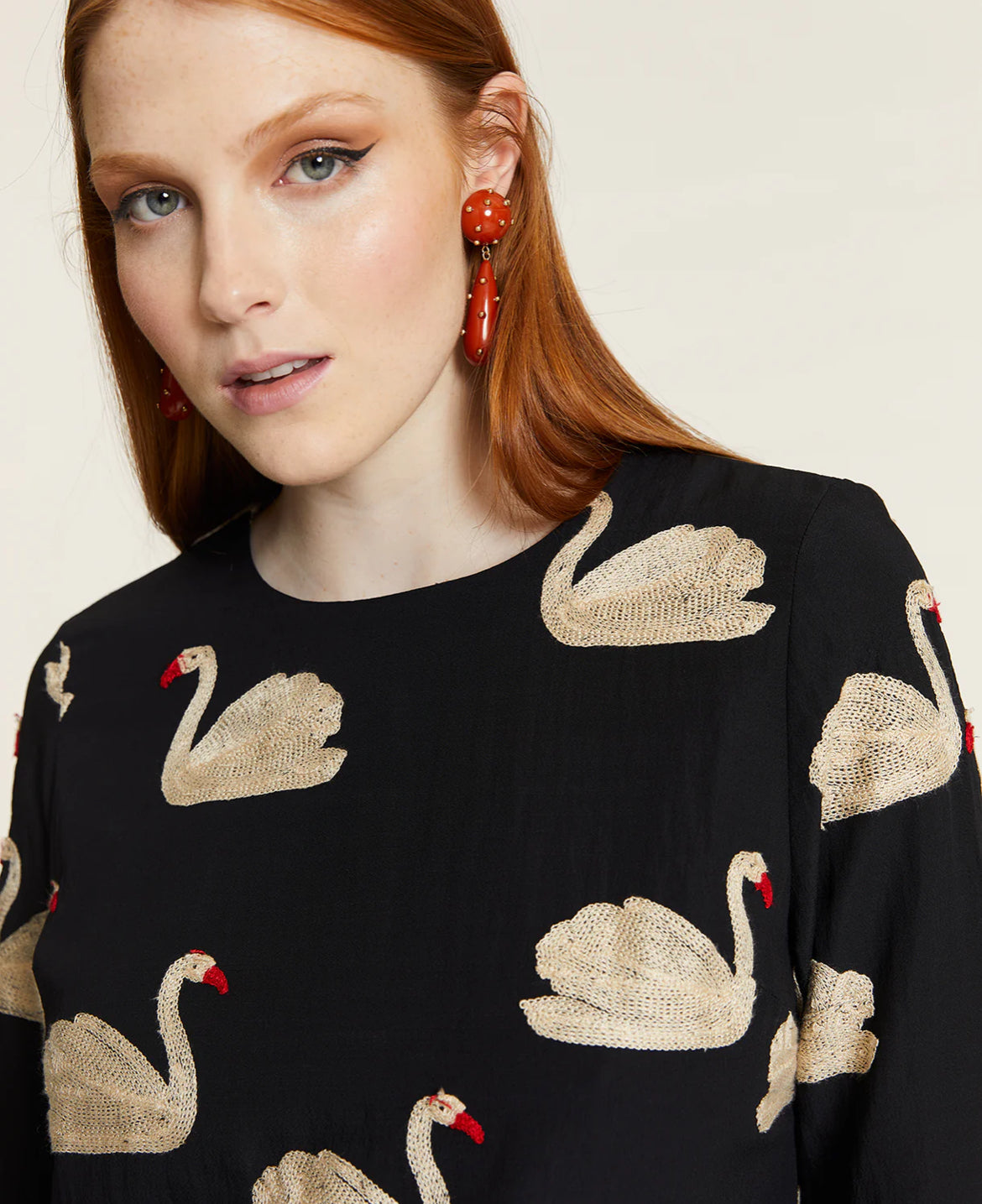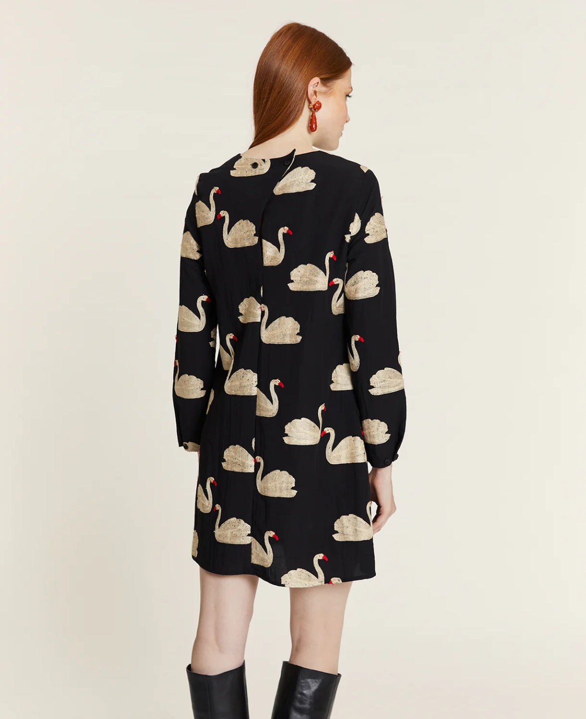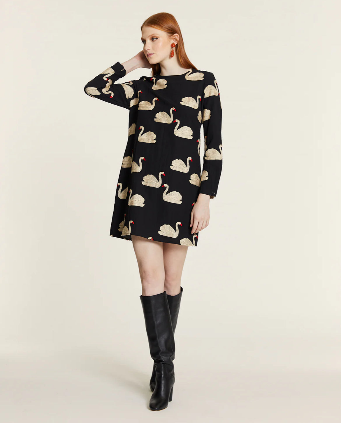 La meraviglia! Abito dal taglio dritto fondo nero con cigni ricamati. Bellissimo anche con una cintura in vita!