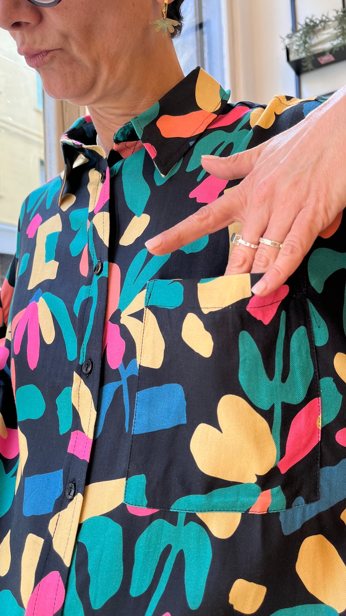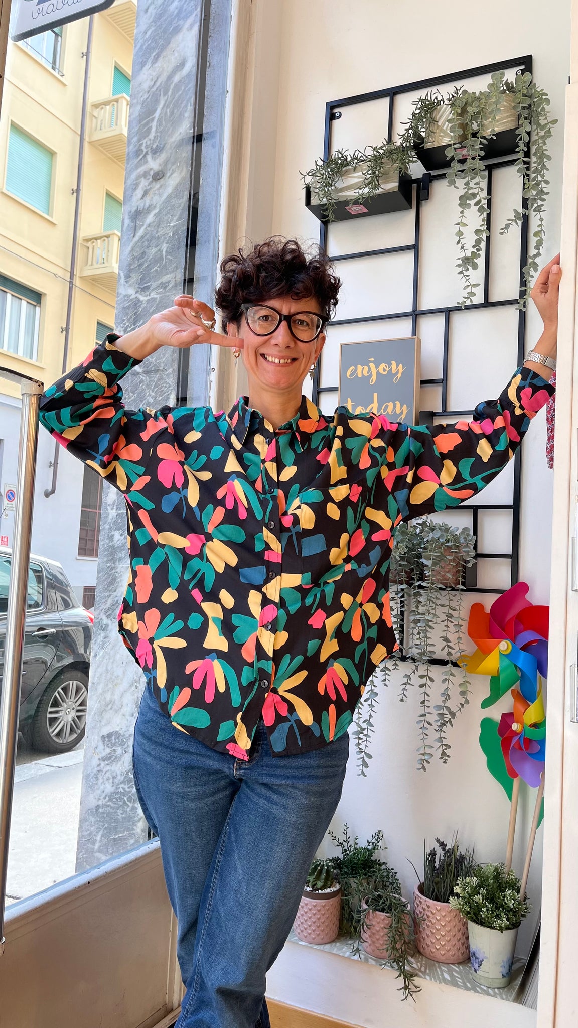 Camicia con stampa a petali, abbottonatura centrale, colletto classico, maniche lunghe dritte e polsini quadrati, taschino.