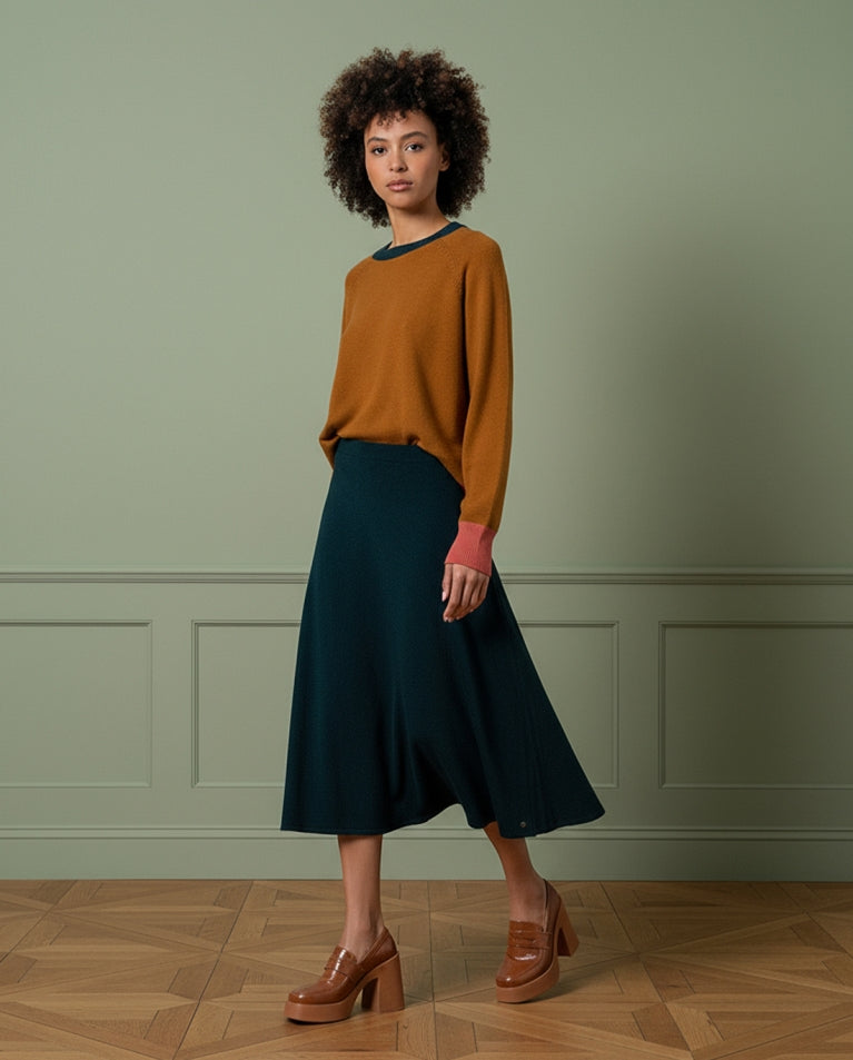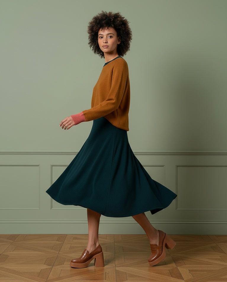 Gonna midi a ruota, senza cerniere né bottoni, elastico in vita.