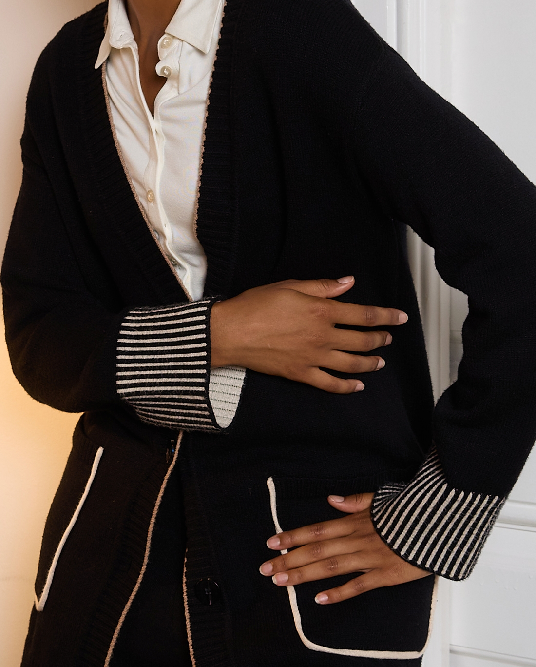 Cardigan in tricot con chiusura a bottoni, tasche applicate e profili a contrasto. Un capo comodo, di media lunghezza, per ogni look. In mezza stagione è perfetto anche come cappottino!
