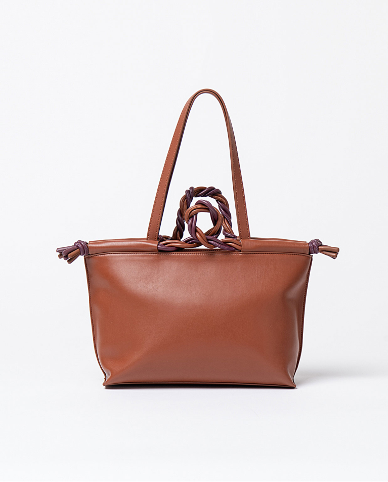 Borsa in simil pelle dal design funzionale ed elegante. Ha due manici corti bicolore intrecciati per portare la borsa a mano e due più lunghi per indossarla a spalla. Chiusura superiore con zip e due scomparti interni, uno aperto e uno con zip.