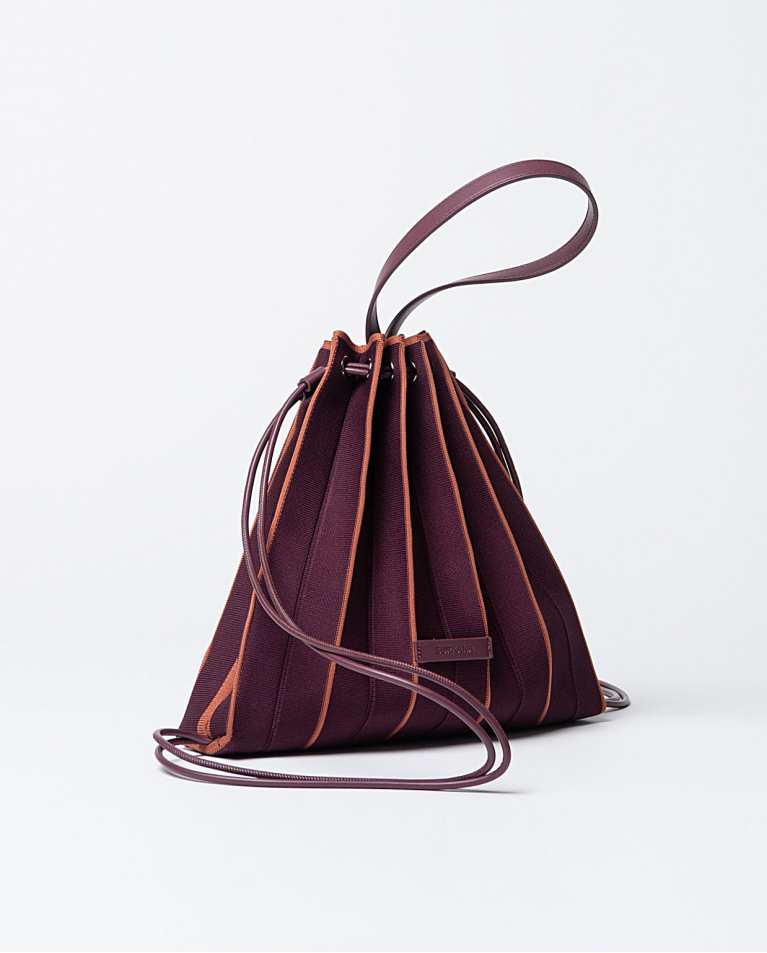 Zaino-borsa lavorato a maglia con texture plissettata e un design triangolare molto particolare. La chiusura è realizzata con cordoncini che scorrono attraverso occhielli, consentendo di regolarla facilmente tirando le cinghie. Si può portare come zainetto o come borsa a spalla.